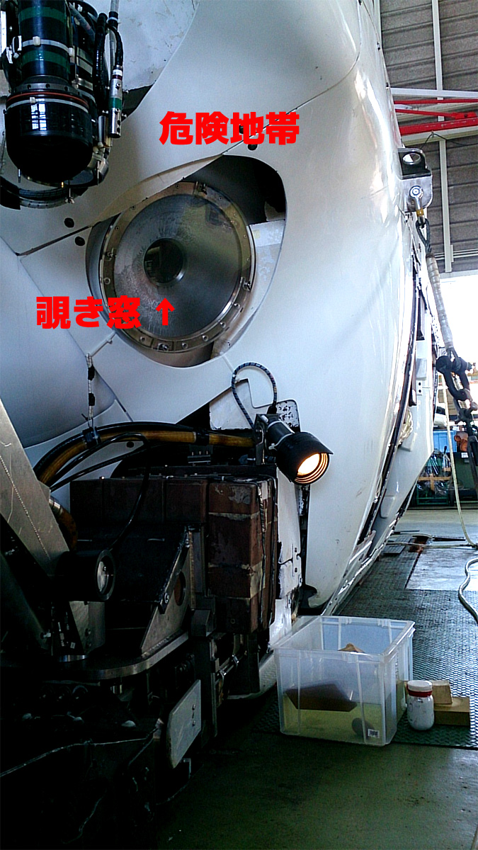 ここでちょっと耐圧殻(球形のコックピット)の中が気になった。覗き窓の外側から内側の様子が小さくチラチラと見えるのだ。そこで恐る恐る首を伸ばして覗き込んでみた。ああ、なんかヒトがいるね、狭そうだね、暑そうだね、深海生物たちからはこう見えているんだねぇ、と思って首を引っ込めた瞬間、「ゴスッ!」と上の方から音がした。それと同時に後頭部に痛みも感じた。なにかと思ったら覗き窓の部分が少しえぐれていて、頭上にぶつけるところがしっかりと用意されていたのだ。誰かに「大丈夫ですか?(笑)」と聞かれたが、余りの恥ずかしさに、大丈夫なのかどうかはよく分からなかったが、とりあえず「大丈夫です」と答えた記憶が微かにある。