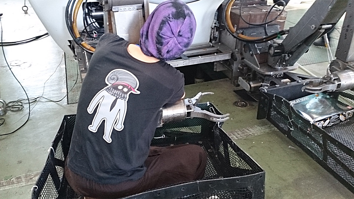 さすがはチタン合金、ヒンヤリしていてこの部屋ではとても気持ちがイイ。なかなかの抱き心地である。このまま深い海へと連れて行ってもらいたいぐらいだ。そのままバックドロップを仕掛けようとしてもビクともしない。腕っぷしの強さも問題なさそうだ。異常なし。しかし実はこの腕、例えばチムニーの隙間などに挟まったりして不意に動けなくなってしまった場合に備え、カニのハサミのように根元から「自切」することができるのだ。そして腕だけを置き去りにし、本体だけは逃げ帰ることができるという、なかなか切ない腕なのである。ちなみにその時にサンプルバスケット内に貴重な深海生物などが入ってたとしても、それをも放り出して帰宅するそうだ。
