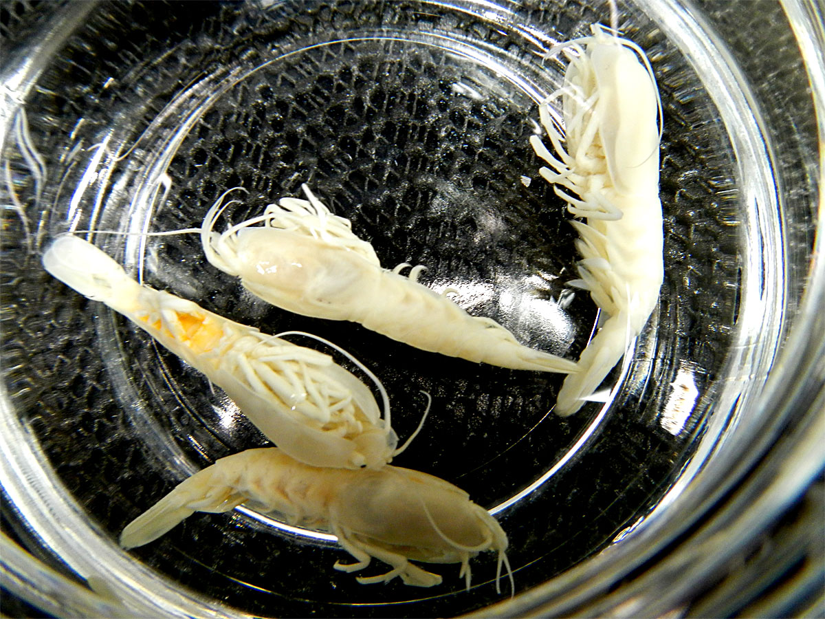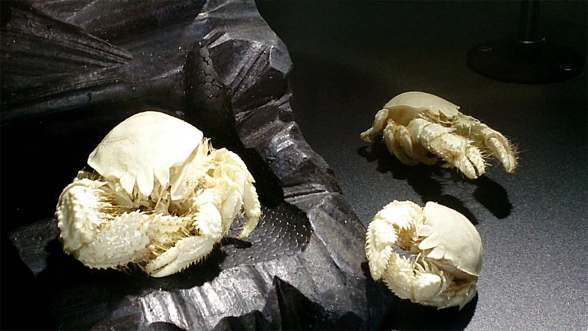 これまで度々「伝説のエビ」というフレーズが登場したとは思うが、エビごときの一体なにが伝説なのかという部分に触れておく。伝説の潜行生中継の際に、光ファイバーケーブルが切れて、映像が途絶えた瞬間があった。前にも書いたが、その直前に「しんかい6500」に乗っていた研究者が「ウッヒャアアアァァァ!!!」とか叫びながら巨大なチムニーを倒壊させたのだ。その沈みゆくチムニーにビッシリとへばり付いていたのがこのエビなのである。その後、ケーブルが切れたのはそのエビの呪いだという噂が広がり、そして伝説は創られた。その研究者が呪われたのかどうか、真相は不明だが、あくまでも噂である。この見学会の後に行われたニコ生の「おかエビ~!深海5,000メートルへの挑戦【「しんかい6500」帰国報告 整備場から生中継】」のタイトルにもある「おかエビ~!」という部分もこのエビにちなんだモノである。