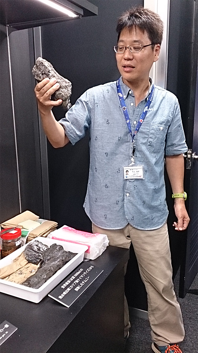 ついでに公式グッズも売られていたので覗いてみると、”非公式Tシャツ” を扱う立場にあるボクらは、やはり公式Tシャツというモノが気になる。デザインの種類も多く、値段も安いので買ってるヒトも結構いる。こりゃ敵わんとか思ってたら、またまたワツジさんがサイドインしてきて、「JAMSTECはグッズで儲けを出しちゃあイケないんですよ」と教えてくれた。なるほど、このどこからともなく現れる感じといい、コメントといい、ニヤニヤといい、この方は「必殺添乗員」としても活躍できそうではないか。